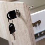 Guías telescópicas. Cerradura centralizada. Cajones con corte a 45º enchapados. Top con molduras.